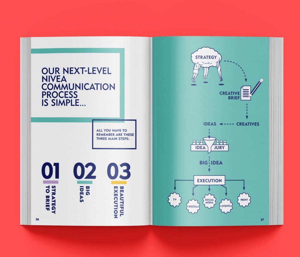To improve NIVEA’s communication the company decided to educate every employee and to bring them on the same page when it comes to advertising. Therefore we have created “THE NIVEA IDEA BOOK – your friend for next level communication”.